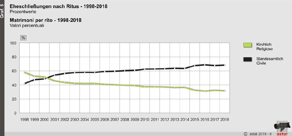 Das Heiratsverhalten in Südtirol weicht auch hinsichtlich des Trauungsritus vom restlichen Italien ab: 2018 lassen sich hierzulande 31,8% aller Paare kirchlich und 68,2% standesamtlich trauen. Im Schnitt werden in ganz Italien 49,5% der Ehen vor dem Standesbeamten geschlossen. Während in Nord- und Mittelitalien die standesamtlichen Hochzeiten mehr als die Hälfte aller Eheschließungen ausmachen, bevorzugen heiratswillige Paare in den süditalienischen Regionen traditionsgemäß den kirchlichen Ritus (2017: letzte verfügbare, gesamtstaatliche Daten).