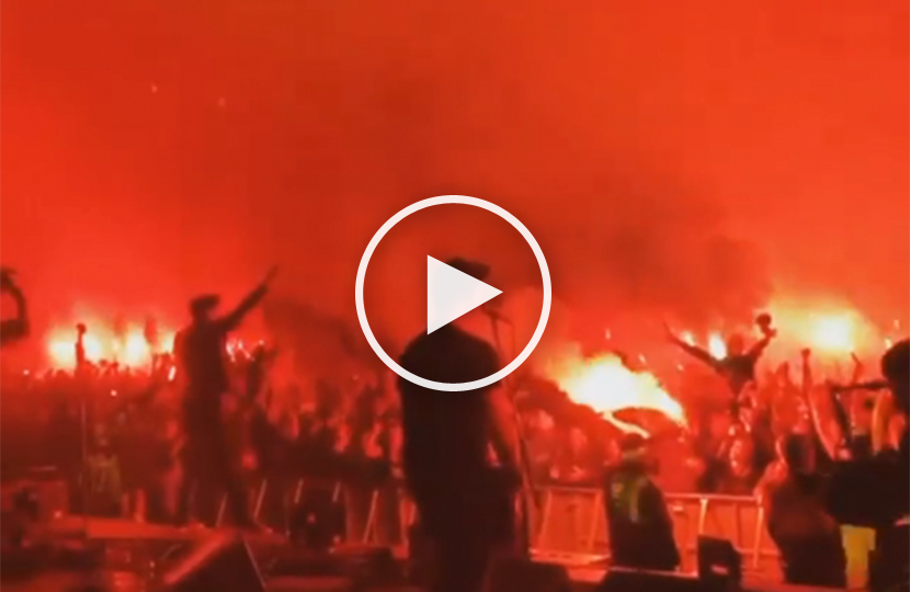 Sobald die Band ihren Gassenhauer für Fußballfans angekündigt hatte, verwandelte sich der Zuschauerbereich in ein riesiges Feuerspektakel.