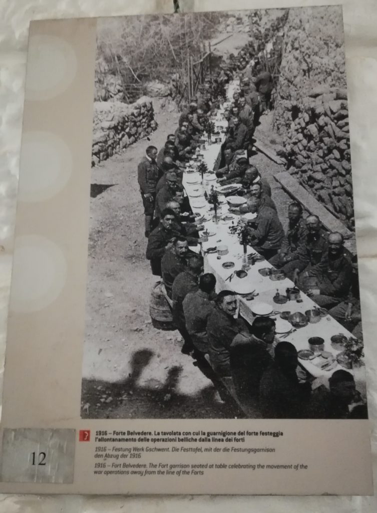 In un corridoio si possono vedere delle foto storiche dell’epoca. Una ritrae un pranzo allestito all’aperto sulla strada che ancora oggi si percorre per arrivare al forte. È un fatto accaduto quando nel 1916 dopo la “Strafexpedition – offensiva di maggio”, la linea del fronte si è spostata più a sud verso il Veneto. Finalmente i soldati hanno potuto uscire e hanno festeggiato con un pranzo all’esterno del forte. Non stupisce il fatto che abbiano voluto vedere la luce del sole, respirare un po’ d’aria, sentire il vento, dopo tutto quello che avevano passato. Un’altra foto ritrae i soldati in ginocchio davanti ad un capitello costruito nel 1865, ancora esistente a Lavarone nella frazione Gasperi al bivio con la frazione Cappella, in occasione della Messa e processione del Corpus Domini.