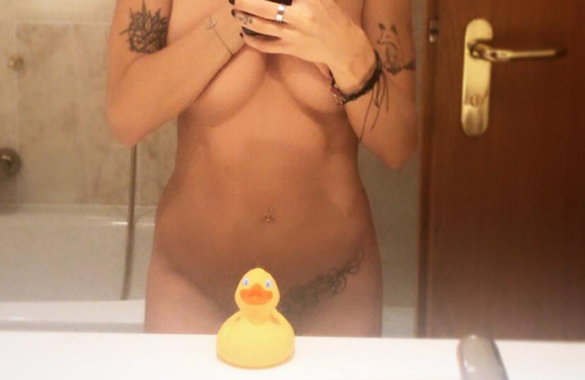 Auf einem Foto, welches sie komplett nackt vor ihrem Badefensterspiegel zeigt, verdeckt nur ein gut platziertes Gummientchen strategisch den Genitalbereich der Sängerin.