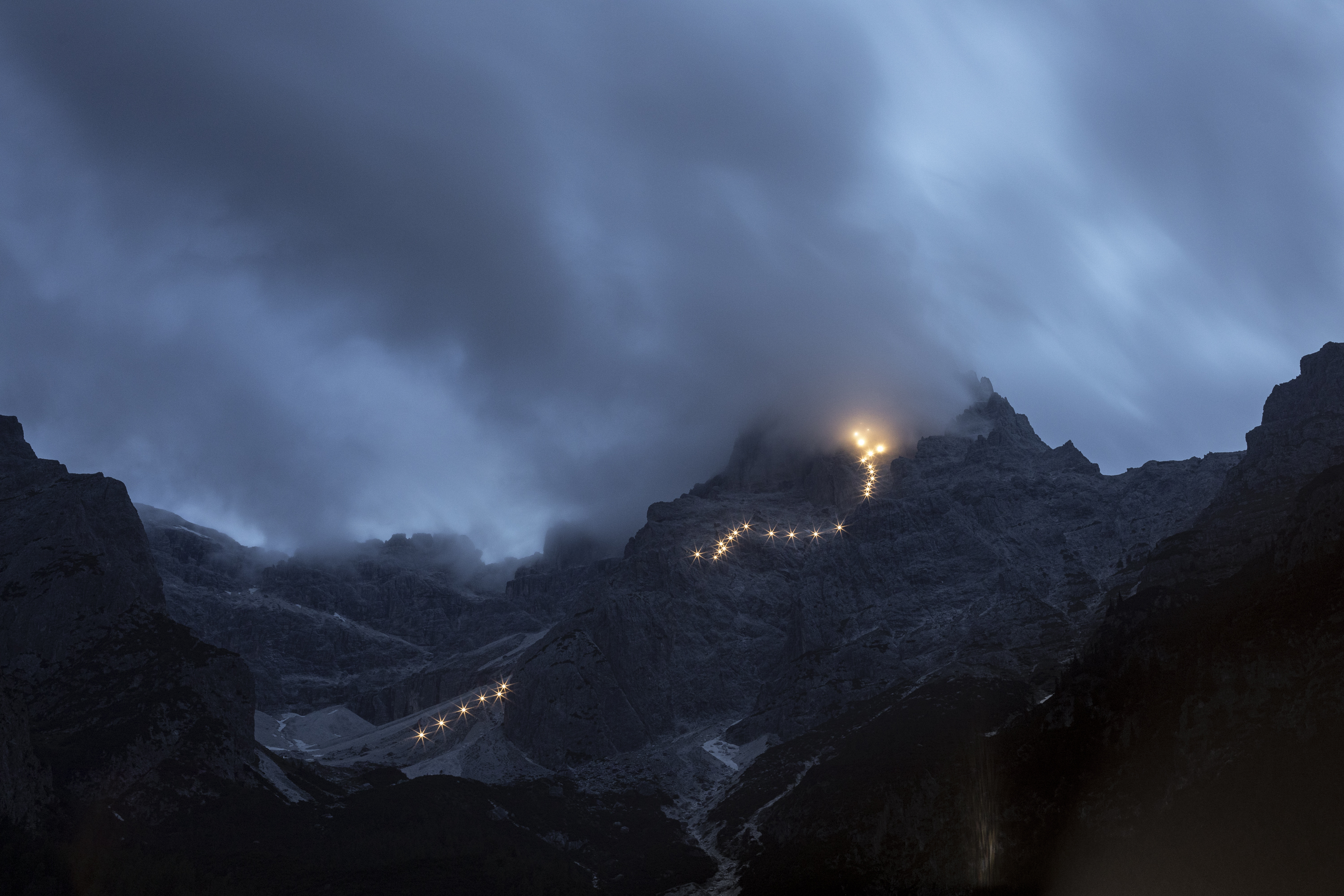 Höhepunkt war eine einmalige Beleuchtung, die die Erstbesteigungsroute auf der Originalstrecke im Dunkeln nachzeichnete. Dazu hatte die Bergrettung Sexten an markanten Stellen Laternen angebracht, die in der Dämmerung zu leuchten begannen. Ein nachhaltiges Projekt, denn die Laternen wurden bereits wieder entfernt und können als wertvolles Erinnerungsstück im Tourismusverein Sexten erworben werden.