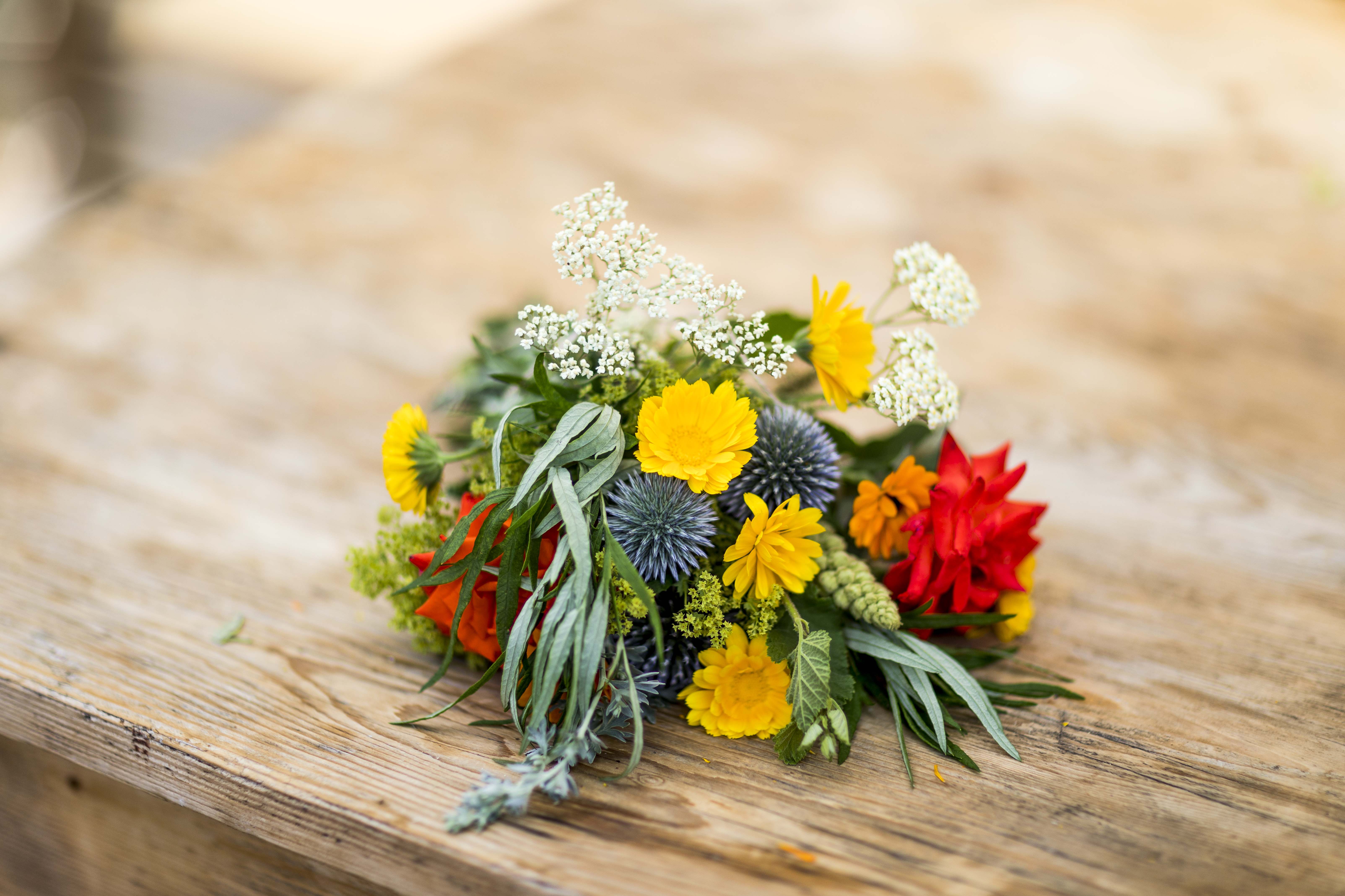 Heutzutage wird der Kräuterbuschen zusätzlich mit Blumen und Kräutern aus dem Garten verschönert, z.B. mit Ringelblume, Rosen und Haselnussblättern.