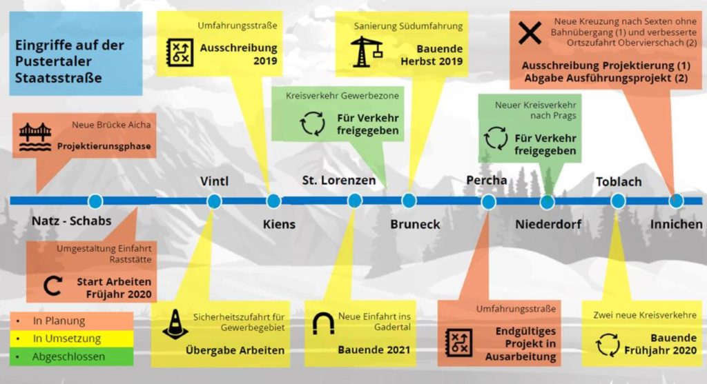 Aktuell in Bau und voraussichtlich bis Frühjahr 2020 fertig sind die zwei neuen Kreisverkehre in Toblach, die zwei Knoten ersetzen und den Verkehr besser entflechten und weiterweiterleiten. Im Gange ist auch die Sanierung der Südumfahrung in Bruneck. Dort wird bis September der Belag erneuert, damit die Straße bei Regen sicherer wird. Auf Hochtouren läuft der Bau der neuen Einfahrt ins Gadertal bei St. Lorenzen. Diese soll ab 2021 die Pendler- und Touristenströme kreuzungsfrei und somit flüssig leiten sowie St. Lorenzen und Pflaurenz vom Durchzugsverkehr entlasten. Durchgeführt wird in Kürze außerdem ein Eingriff für mehr Sicherheit bei der neuen Zufahrt beim Gewerbegebiet in Vintl. Dafür stehen die Arbeiten vor der Übergabe.