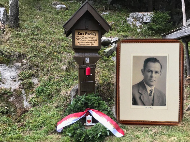 " Luis Amplatz Geb. am 28. August 1926 in Gries bei Bozen. Hier getötet durch bezahlte Mörderhand am 7. September 1964. Er lebte und starb für ein gemeinsames Tyrol" (Text von Genktafel)