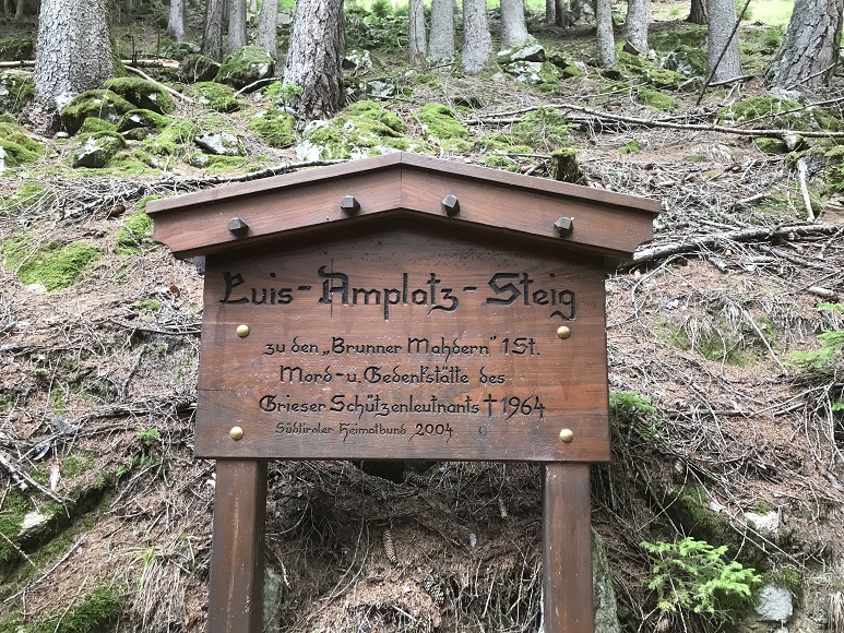 " Luis Amplatz Geb. am 28. August 1926 in Gries bei Bozen. Hier getötet durch bezahlte Mörderhand am 7. September 1964. Er lebte und starb für ein gemeinsames Tyrol" (Text von Genktafel)