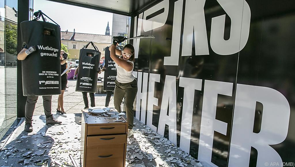 Am Mittwochmorgen eröffnete Badora gemeinsam mit den Schauspielern Julia Kreusch, Peter Fasching (er spielt die zu explosiven Wutausbrüchen neigende Hauptfigur Freiherr Childerich III. von Bartenbruch) und Thomas Frank die Installation, in der jeweils fünf Minuten lang in Schutzkleidung zum „Zertrümmern von ausgedientem Porzellan, Elektrogeräten und IT-Zubehör“ eingeladen wird.