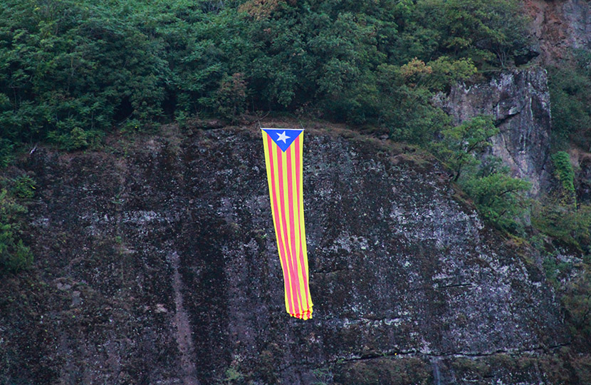 Mit einer riesengroßen katalanischen Fahne bei der „Schwarzwand“ in Lana, die von Burggräfler Schützen gehisst wurde, drückt der Südtiroler Schützenbund seine Solidarität mit dem katalanischen Volk aus.