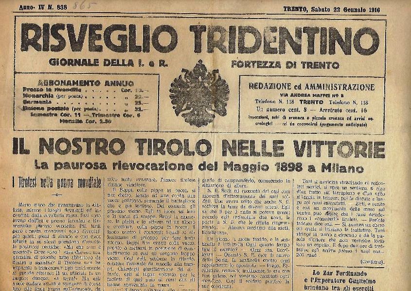 Un articolo scritto da un corrispondente di guerra più di cento anni fa, pubblicato sabato 22 gennaio 1916 sul giornale „Il Risveglio Tridentino“ – il giornale della Imperial Regia Fortezza di Trento. Qui vengono narrati degli episodi successi ad un certo Peppi, a Giacomo e a Toni. Ricordiamoci che questi stessi episodi potrebbero essere accaduti ad un qualsiasi nostro parente che difese la Vaterland, l’Imperatore e la Heimat Tirolese nella prima guerra mondiale.