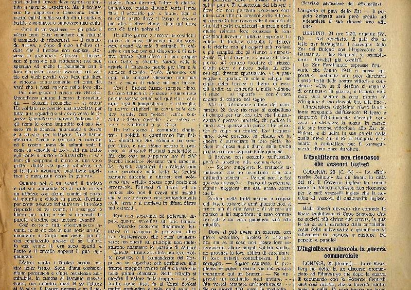 D’altro canto i Tirolesi sanno anche tener fermo. Sono d’una resistenza ammirabile. In trincea si lasciano massacrare, ma indietro mai! E se l’affare si fa serio il lavoro penoso e se il nemico tenta avanzare, l’umore tirolese rimane vincitore.