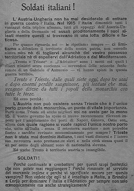 Entrambi hanno nomi italiani, entrambi parlano italiano, ma sono nemici. Il 24 maggio del 1915, infatti, l’Italia aveva dichiarato guerra all’ex alleata Austria (e quindi anche al Tirolo di lingua romanza), tradendo la precedente alleanza e assumendo così il ruolo dell’aggressore nel momento in cui ad essa sembrava opportuna una partecipazione al conflitto in vista di una facile vittoria. Alla fine, come sappiamo, per l’Italia la vittoria arriverà, ma la guerra non sarà stata affatto semplice, né tanto meno rapida. A migliaia avrà portato via a povere famiglie, sia austriache che italiane, i propri figli e mariti in quella che nel 1917 papa Benedetto XV chiamerà “inutile strage”. E ad accomunare tutti, un unico comune denominatore: l’obbedienza ai propri governi e l’incapacità di capire sino in fondo le ragioni di quell’assurda guerra.
