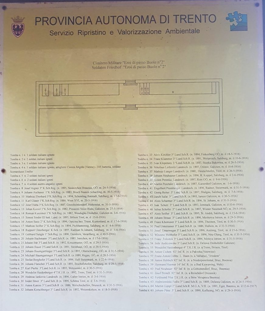 Ma perché ricordare gli Standschützen a Passo Buole? Fra i nomi del lungo elenco di soldati sepolti nel Soldatenfriedhof „Eroi di Passo Buole Nr. 2“, caduti nei sanguinosi scontri della Frühjahrsoffensive, fra il 15 maggio e il 27 giugno 1916, non sembrano essercene.