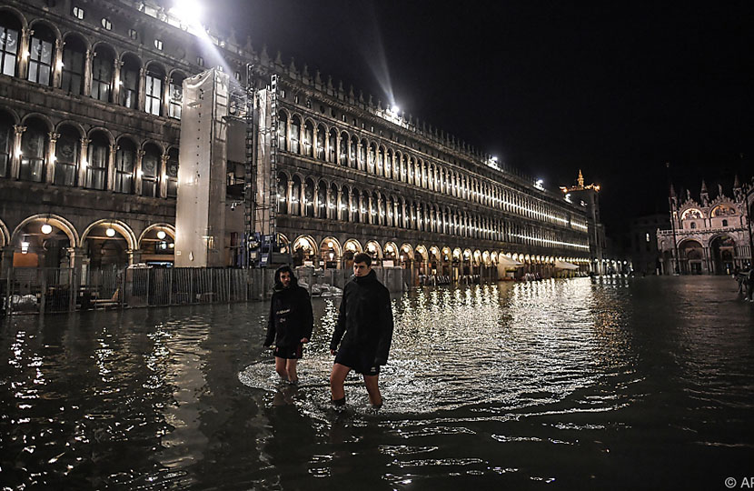 Der Markusplatz in der UNESCO-Welterbestadt war vollkommen überflutet. Touristen und Einheimische wateten zunächst noch in Gummistiefeln über den Platz, am Abend stieg das Wasser auf mehr als einen Meter. Nur noch die Polizei fuhr mit Booten über den Platz. Auch in den Markusdom drang das Wasser ein. Es habe unter anderem Schäden am Mauerwerk angerichtet, berichteten italienische Medien. „Wir versuchen, den Schaden in Grenzen zu halten“, sagte der Ingenieur der Basilika, Pierpaolo Campostrini, der Nachrichtenagentur ANSA.