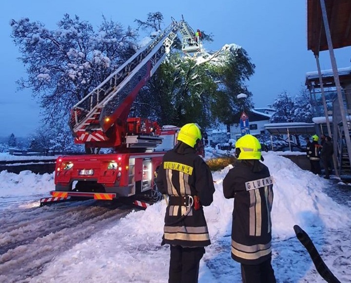 Die Wehrmänner der Freiwilligen Feuerwehr Glurns standen am Sonntag pusenlos im Einsatz, um die Bevölkerung vor Gefahren durch umstürzende Bäume zu schützen. Im Einsatz stand auch die Drehleiter.