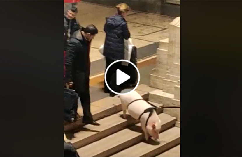 Frau geht mit Schwein am Bahnhof Gassi – VIDEO