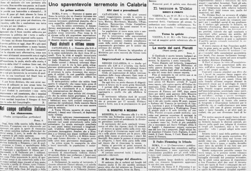 Luigi Barzini, storico inviato del Corriere della Sera, scrisse l’11 settembre un editoriale in cui diceva: “In Calabria si muore. I danni del terremoto sono immensi, ma sono le vecchie piaghe della Calabria che li hanno fatti tali e che adesso rendono difficile ripararli”. Era un grido disperato di soccorso. In effetti, dall’Unità d’Italia in poi non c’erano stati grandi cambiamenti in Calabria. Sotto il governo giolittiano, il ministro Sonnino aveva sì prestato attenzione alla questione meridionale, ma favorendo i potenti ceti agrari sperando che le masse contadine ne avrebbero tratto vantaggio. La formula, piuttosto discutibile, non aveva però funzionato.