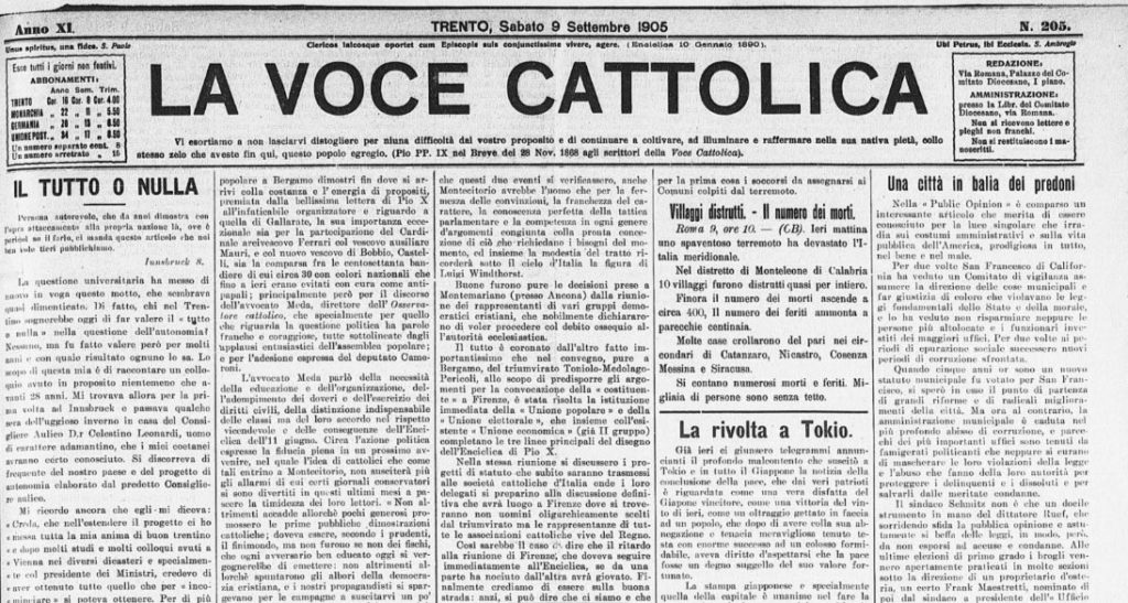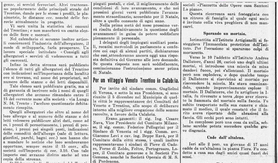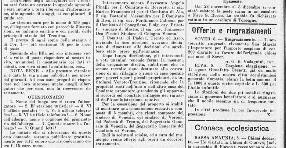 Il giornale trentino “La Voce Cattolica”, di cui era direttore un giovanissimo Alcide Degasperi, nell’edizione del 9 dicembre 1905 riportava la notizia in cronaca, annotando come i rappresentanti dei singoli comitati riunitisi a Verona, dopo lunga discussione avevano stabilito “che le somme raccolte sarebbero state destinate alla costruzione di un villaggio di case operaie per i poveri da intitolarsi Veneto-Trentino”.