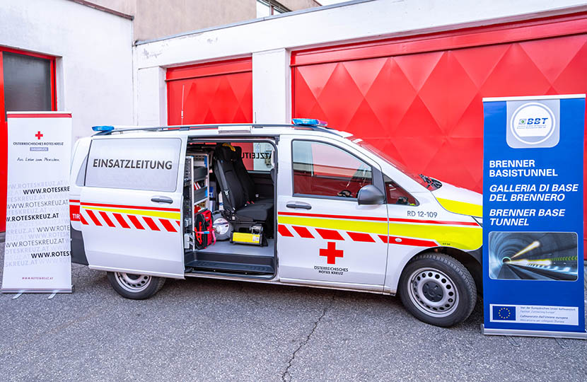 Die Finanzierung des Fahrzeuges erfolgte durch das Rote Kreuz gemeinnützige Rettungsdienst GMBH und die BBT SE gemeinsam, welche die Kosten für die erforderliche Zusatzausrüstung zur optimalen Einsatzabwicklung im Baustellenbereich übernahm. Dipl.-Ing. Martin Gradnitzer Vorstand der BBT SE betont die Wichtigkeit der Zusammenarbeit mit allen Einsatzorganisationen da Sicherheit und rasche, effiziente Hilfe für alle Mitarbeiter in den verschiedenen Baustellen Bereichen höchste Priorität hat.