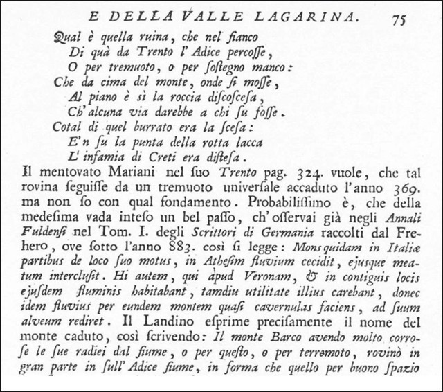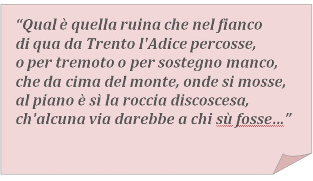 Può dirci, ad esempio, che secondo antichi documenti il “Monte Barco” crollò sull’alveo sottostante dell’Adige nell’anno 883 (altri fanno riferimento al terremoto del 1117) e la causa fu appunto il cedimento della parete per movimento tellurico.