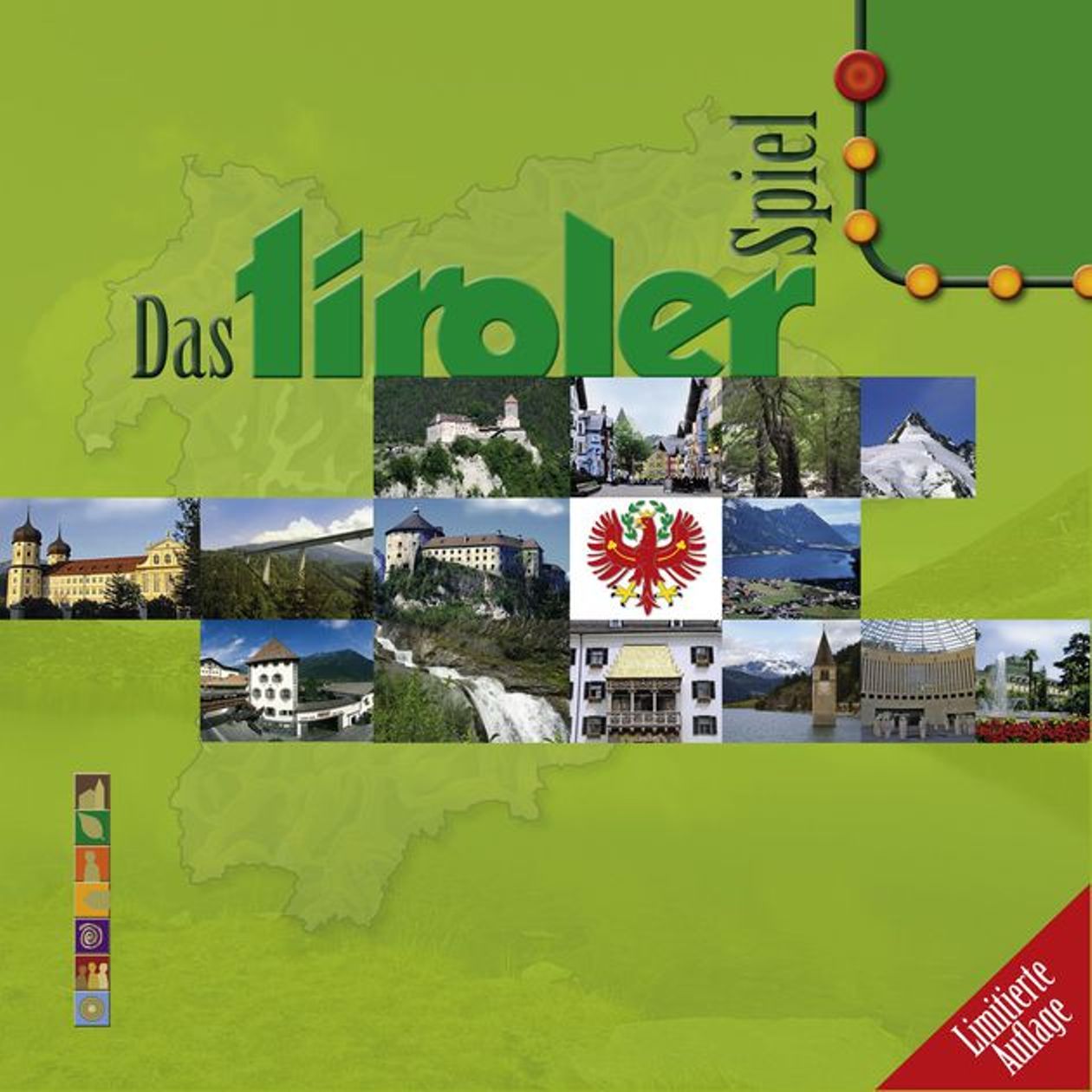 Con una particolarità : il percorso nemmeno troppo immaginario delle caselle accompagna i giocatori in giro per l’intero Tirolo. Intero sul serio, da Kufstein a Borghetto, da Resia a Campitello, da Dobbiaco a Vermiglio. Non per niente si chiama appunto DAS TIROLER SPIEL, il gioco tirolese.