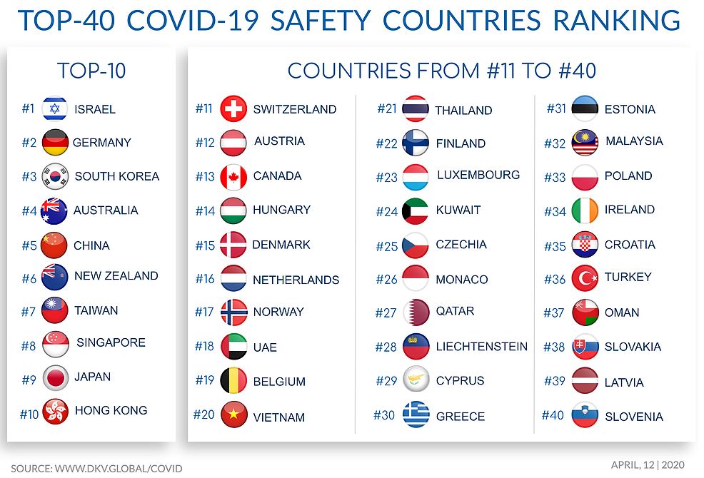 Wenn es um die Gewährung von Sicherheit im Umgang mit der Krise geht, landet hingegen Deutschland weltweilt auf dem zweiten Rang (1. Israel). „Deutschland hat im Vergleich zu den anderen Ländern derzeit das beste Sicherheits- und Stabilitätsranking in Europa und gehört auch weltweit zu den führenden Nationen in Sachen Krisenmanagement“, sagt der Datenexperte Dmitry Kaminsky, Gründer von Deep Knowledge, dem Spiegel.
