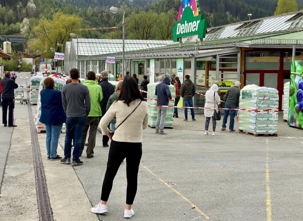 In Baumärkten und Gartencenter in Tirol kam es am Vormittag zu teilweise zu langen Warteschlangen. Zahlreiche Menschen standen bereits vor der Öffnung der Geschäfte vor geschlossenen Türen an. Dies zeigen Fotos des Gartencenters Dehner und des Baumarkts Bauhaus in Völs.