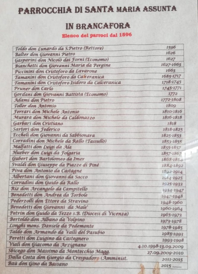 Nel 1934, designato dal vescovo di Trento, arriva a Pedemonte don Arcangelo Riz proveniente dalla parrocchia di Piscine in val di Cembra. Don Arcangelo, nato nel 1899 a Campitello di Fassa da Luigi Riz Peta e Orsola Riz Ticia, è il primo di 10 figli. Si insedia nella parrocchia di Brancafora ed entra subito in piena sintonia con i paesani sparsi nelle varie frazioni del piccolo comune. Oltre che curatore d’anime si presta fin da subito ad aiutare la povera gente stremata dalla mancanza di lavoro.