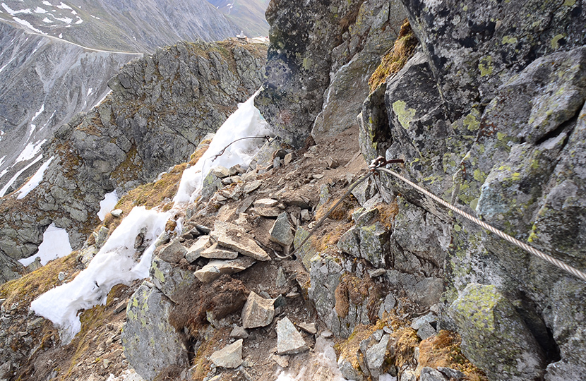 Es ist die Mitnahme von Grödel oder Steigeisen empfehlenswert. Zudem sind teilweise auch Sicherungsseile noch unter Schnee.