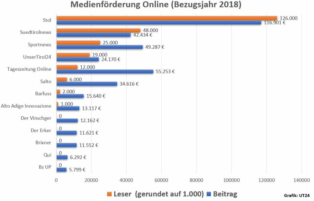 Was sofort ins Auge fällt: Gilt bei Werbeinseraten als erstes Kriterium die Reichweite, trifft dies beim Medienbeitrag nicht zu. Gleich fünf Online-Medien (Vinschger, Erker Online, Brixner, Qui, BZ UP) werden mit einer Tagesreichweite von 0 Lesern ausgewiesen, erhielten aber für das Bezugsjahr 2018 dennoch eine Medienförderung zwischen 5.798,61 Euro und 12.162,14 Euro. Medien mit hoher Reichweite wurden hingegen mit einem unverhältnismäßig niedrigen Beitrag berücksichtigt.