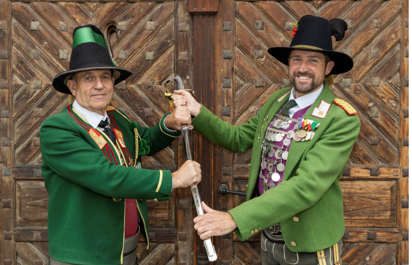 Kommandoübergabe: Der bisherige Landeskommandant Major Mag. Fritz Tiefenthaler überreichte dem neuen Landeskommandanten Major Thomas Saurer den vom ersten Landeskommandanten des Bundes der Tiroler Schützenkompanien, Alt-Landeshauptmann Josef Schumacher, gestifteten Landeskommandanten-Säbel.