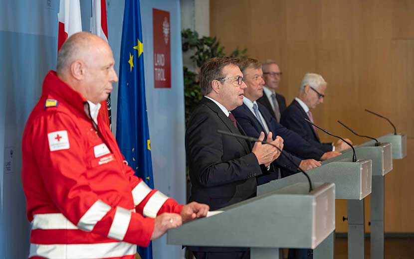 Gemeinsam mit Samariterbund Tirol, Johanniter Unfallhilfe, Malteser Hospitaldienst und Österreichischer Rettungsdienst wird in engster Zusammenarbeit mit der Leistelle Tirol die Sicherheit und Notfallversorgung der Tiroler Bevölkerung und der Gäste gewährleistet. Tirols Landeshauptmann, Gesundheitslandesrat Bernhard Tilg, Arno Melitopulos-Daum (ÖGK Landesstellenleiter Tirol), Bernhard Achatz, (ÖGK Landesstellenausschuss-Vorsitzender), Wilfried Unterlechner(Geschäftsführer Rotes Kreuz Tirol Gemeinnützige Rettungsdienst GmbH), Robert Moser (Präsident Rotes Kreuz) und ErnstSchöpf (Gemeindeverbandspräsident) informierten dazu heute, Montag, im Rahmen einer Pressekonferenz im Innsbrucker Landhaus.