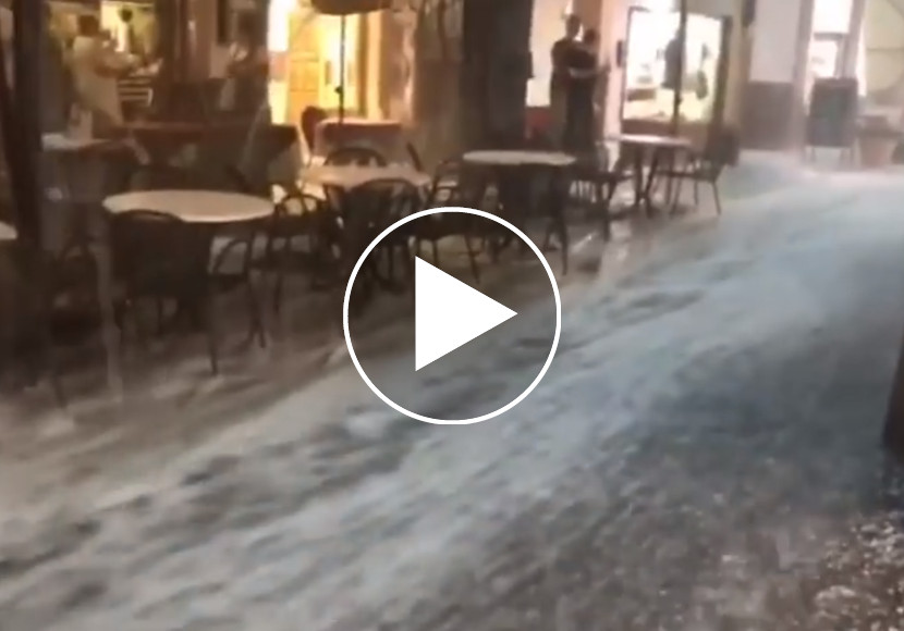 Wie ein reißender Bach rauschen Regenwasser und Hagel durch die Meraner Lauben.