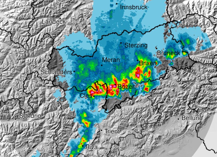 Inzwischen hat Florians Wetterseite ein Update aus Marling geliefert. Dort verzeichnete er Windböen von bis zu 101 km/h (Stationsrekord) und Hagelkörner mit einem Durchmesser von 2 Zentimetern. Bis 17.00 Uhr ging dort 35 mm Niederschlag innerhalb kürzester Zeit nieder.