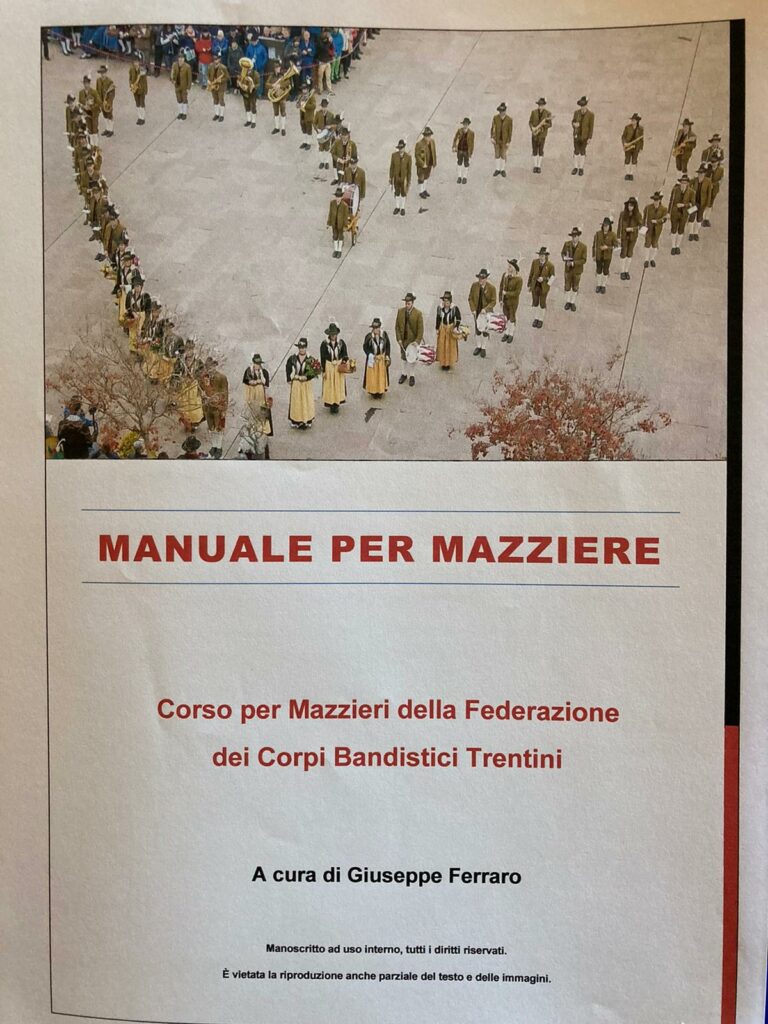 Pure la Federazione ne ha recepito l’importanza, ha iniziato così ad organizzare corsi per mazzieri chiedendomi di redarre un piccolo manuale adatto per la realtà bandistica trentina. L’ho fatto partendo dal nostro modo di marciare quindi facendo ovviamente riferimento allo stile tirolese della “Musik in Bewegung” della federazione austriaca, l’Österreichischer Blasmusikverband,