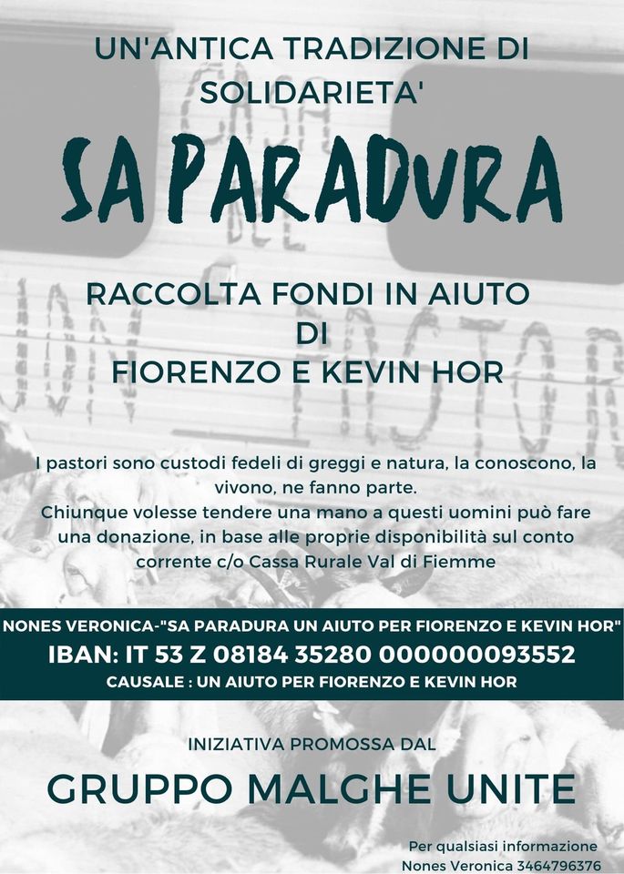 Quindi ecco l’IBAN del conto acceso presso la Cassa Rurale Val di Fiemme, per donare e “fare da bastone” ad un uomo di 50 anni e un giovane ragazzo messi in ginocchio da un qualcosa più grande di loro, perché possano ricominciare a vivere. Purtroppo il momento delicato è adesso e per questo dobbiamo mettere un termine alle donazioni, per poter consegnare il ricavato ai diretti interessati il prima possibile. Le somme devolute saranno versati interamente ai due pastori in difficoltà.