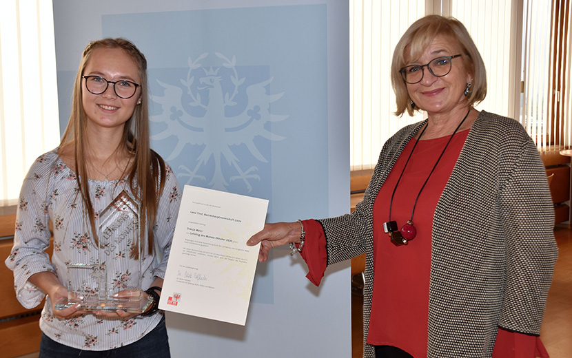 Der „Lehrling des Monats Oktober 2020“ heißt Svenja Maier, kommt aus Prägraten am Großvenediger und absolviert eine Lehre zur Verwaltungsassistentin im ersten Lehrjahr beim Land Tirol in der Bezirkshauptmannschaft Lienz. Bildungs- und Arbeitslandesrätin Beate Palfrader überreichte bei einem Besuch in der BH Lienz persönlich die Auszeichnung an den engagierten Lehrling.