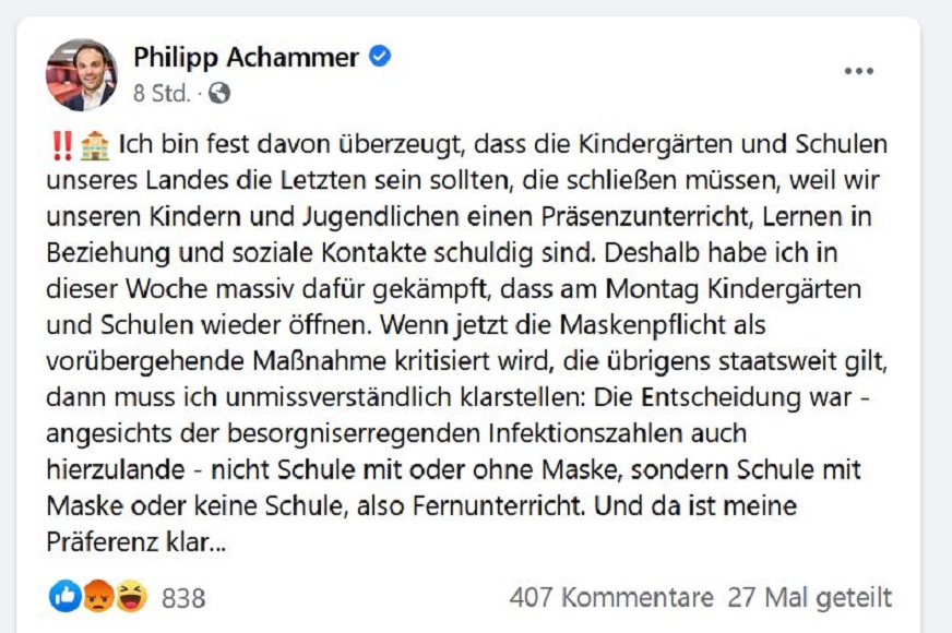 „‼️🏫 Ich bin fest davon überzeugt, dass die Kindergärten und Schulen unseres Landes die Letzten sein sollten, die schließen müssen, weil wir unseren Kindern und Jugendlichen einen Präsenzunterricht, Lernen in Beziehung und soziale Kontakte schuldig sind. Deshalb habe ich in dieser Woche massiv dafür gekämpft, dass am Montag Kindergärten und Schulen wieder öffnen. Wenn jetzt die Maskenpflicht als vorübergehende Maßnahme kritisiert wird, die übrigens staatsweit gilt, dann muss ich unmissverständlich klarstellen: Die Entscheidung war – angesichts der besorgniserregenden Infektionszahlen auch hierzulande – nicht Schule mit oder ohne Maske, sondern Schule mit Maske oder keine Schule, also Fernunterricht. Und da ist meine Präferenz klar…“