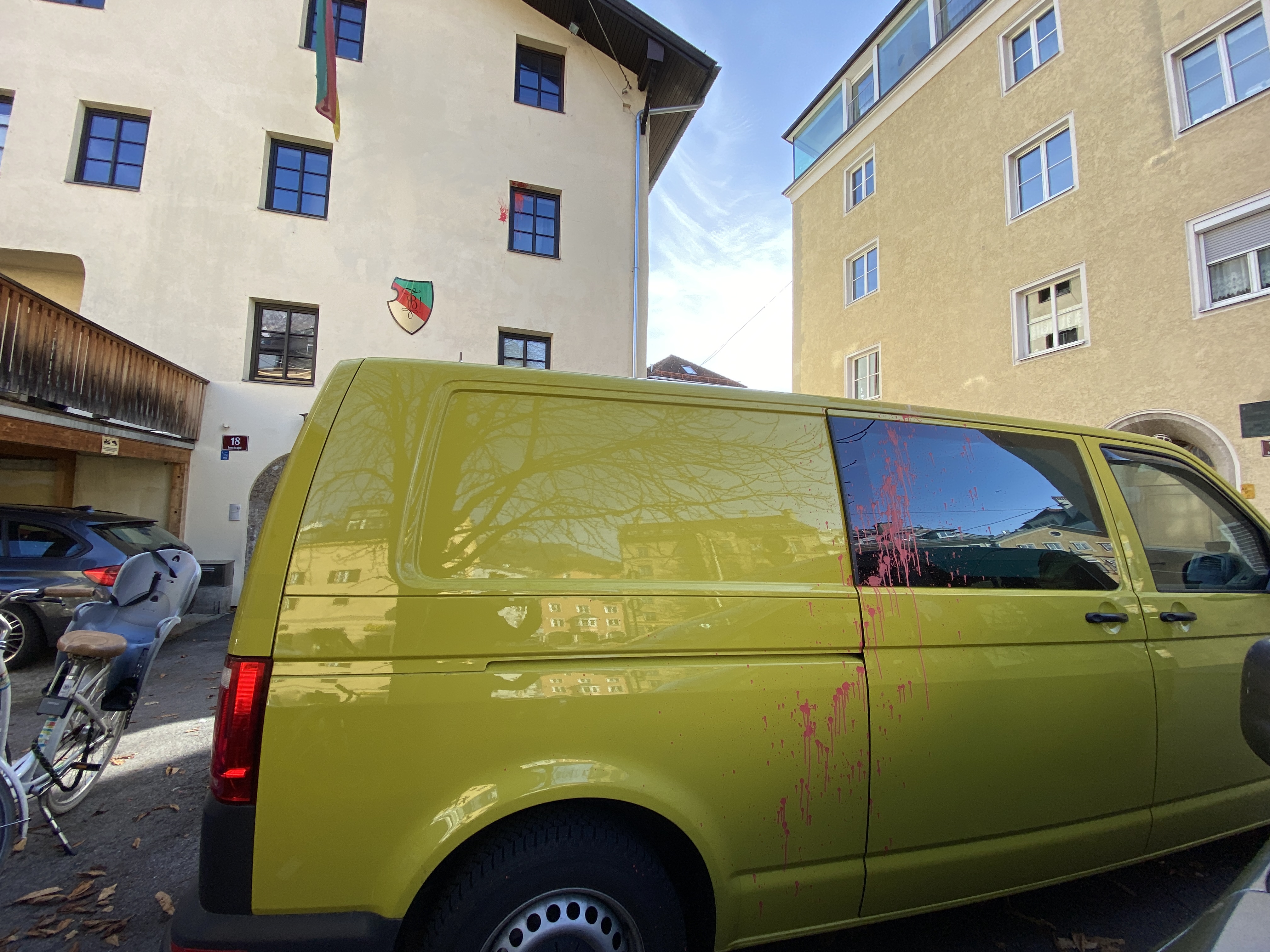 Durch das Farbbeutel-Attentat wurde die Fassade von zwei Häusern sowie vier Fahrzeuge, welche vor dem Haus abgestellt waren, verunstaltet.