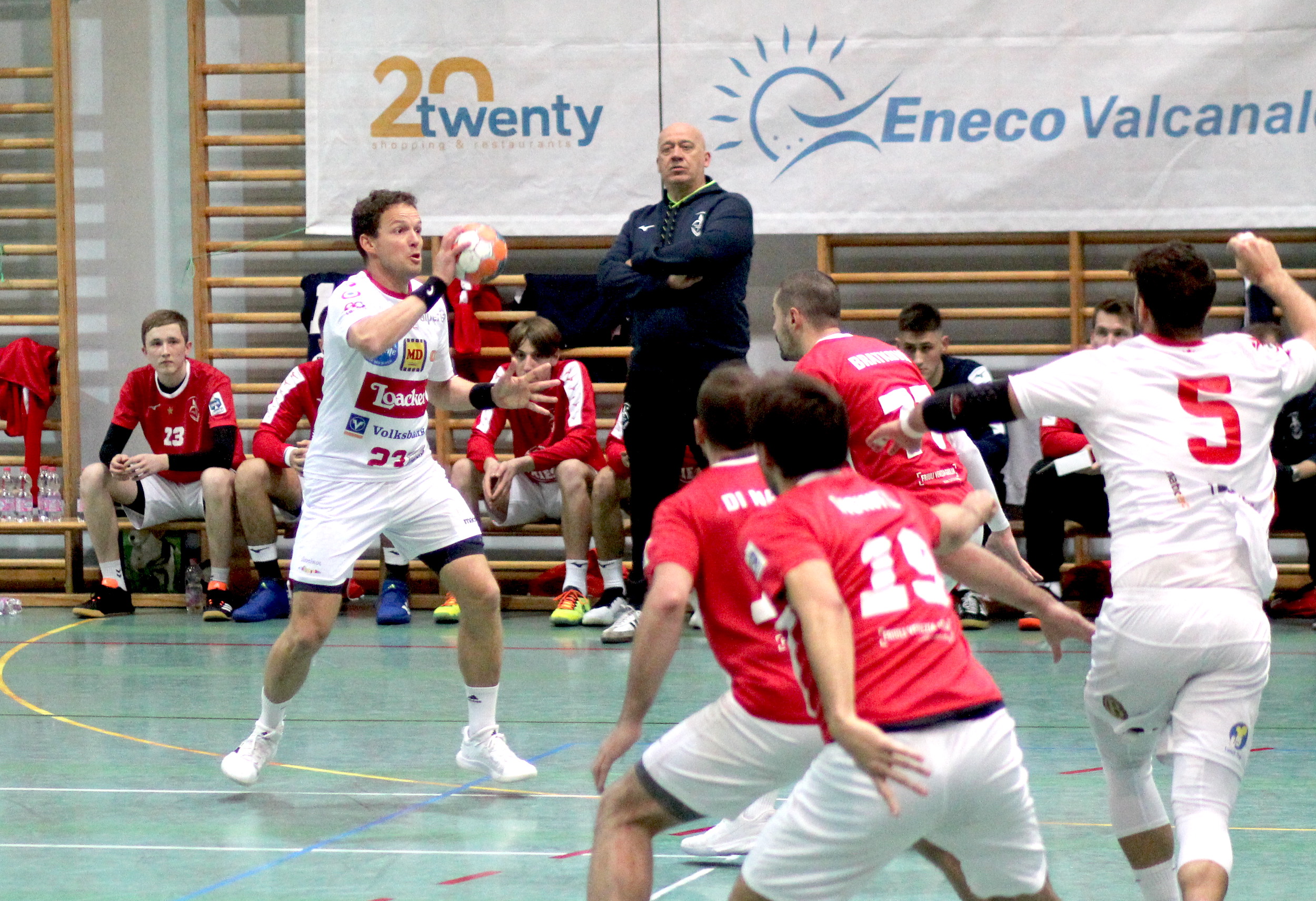 Das Ergebnis kippte erst nach einer Viertelstunde. Turkovic stellte mit drei Treffern in Folge, zwei davon vom Siebenmeterpunkt, auf 9:5. Der Kapitän der Talferstädter feierte an diesem Abend seinen 300. Einsatz für „seinen“ SSV Loacker Bozen Volksbank und schien dieses Jubiläum auch mit jeder Menge an Toren krönen zu wollen. Beim Halbzeitpfiff hieß es schließlich 11:8 aus Sicht der Gastgeber. Eine Drei-Tore-Führung, die man dem bärenstarken Hermones zuschreiben konnte.