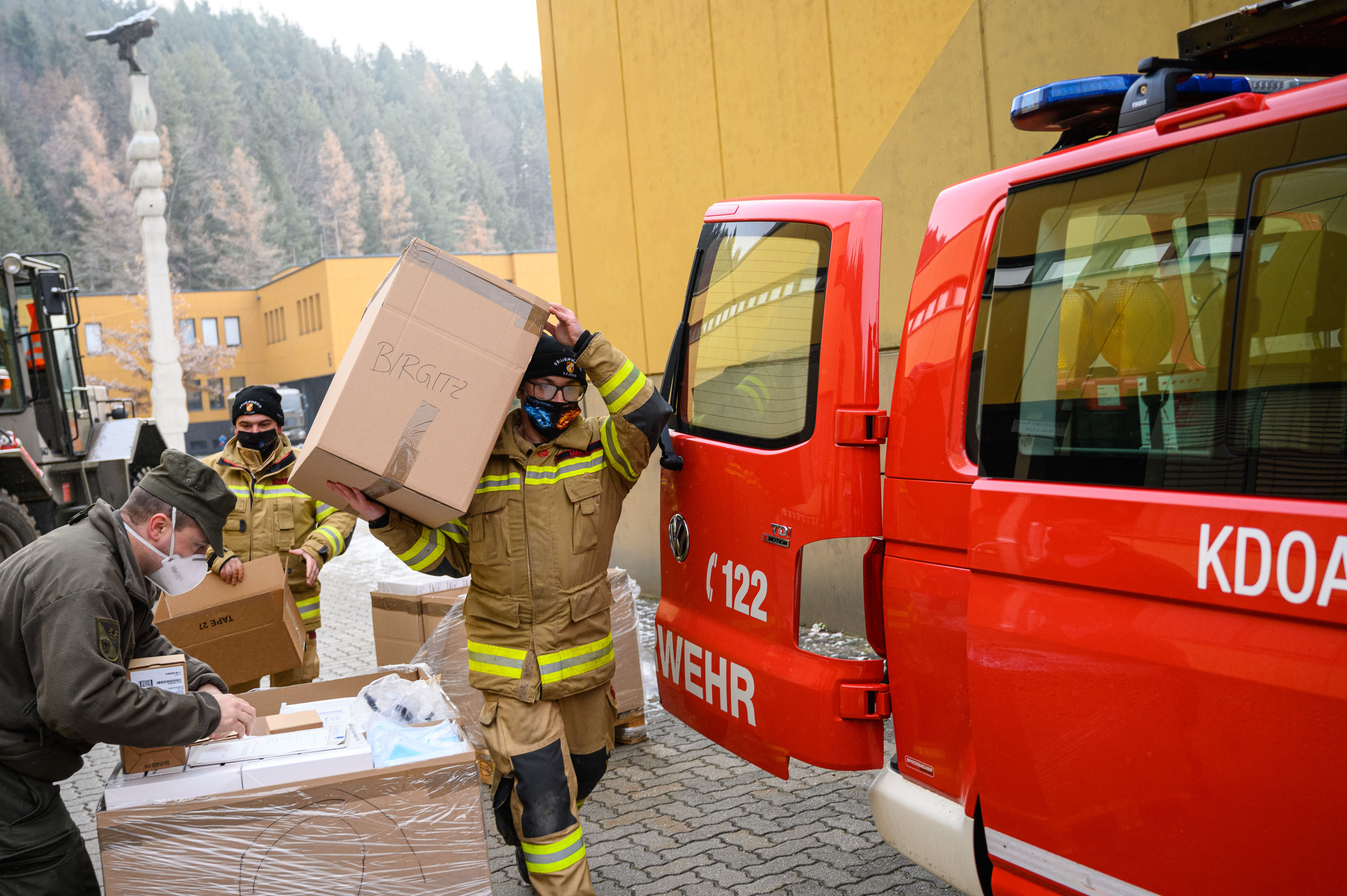 Dort fand heute, Donnerstag, ein Lokalaugenschein mit Elmar Rizzoli, Leiter des Einsatzstabes Corona des Landes, Ingo Gstrein, Militärkommandant von Tirol, und Peter Hölzl, Landes-Feuerwehrkommandant von Tirol, statt. Das Bundesheer kommissionierte die Materialien, im Anschluss übernehmen die Tiroler Feuerwehren: Sie verteilen im Laufe des heutigen Donnerstags die Pakete an die 279 Tiroler Gemeinden. Insgesamt werden an den drei Testtagen in Summe über 4.000 Feuerwehrmitglieder im Einsatz sein.