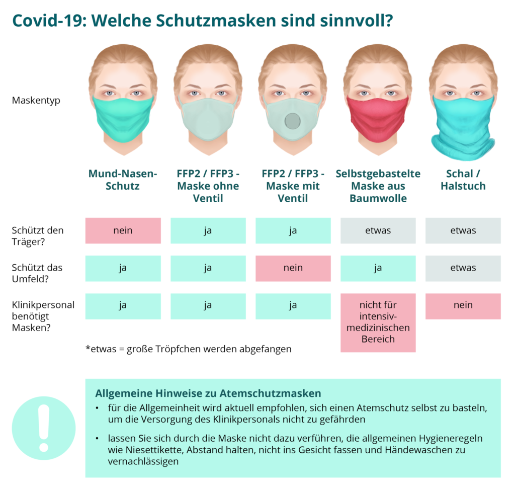 Man unterscheidet zwischen dem Mund-und-Nase-Schutz (MNS) aus Papier oder Vlies und so genannten FFP-Masken (“Filtering Face Piece”) aus gehärtetem Papier oder Stoffen. Masken ab der Schutzklasse FFP2 schützen mit einer Durchlässigkeit von maximal 6% effektiv vor Viren, FFP3-Masken filtern sogar bis zu 99 % der Atemluft-Belastung, jedoch fällt mit ihnen auf Dauer das Atmen schwer.