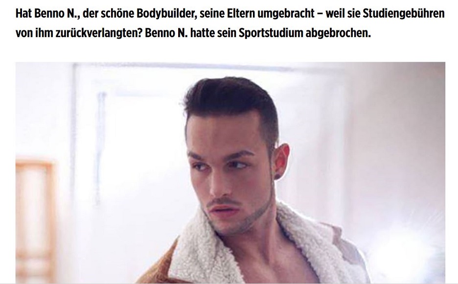 BILD fragt auch: „Hat Benno N., der schöne Bodybuilder, seine Eltern umgebracht – weil sie Studiengebühren von ihm zurückverlangten? Benno N. hatte sein Sportstudium abgebrochen.“