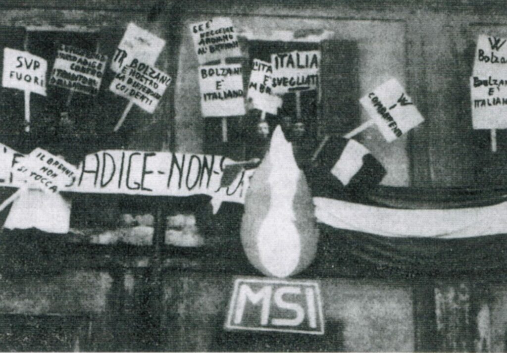 Questa foto dei cartelli e degli striscioni issati presso sede del partito neofascista MSI mostra chiaramente che aggressività ci sia nei confronti del Sudtirolo…