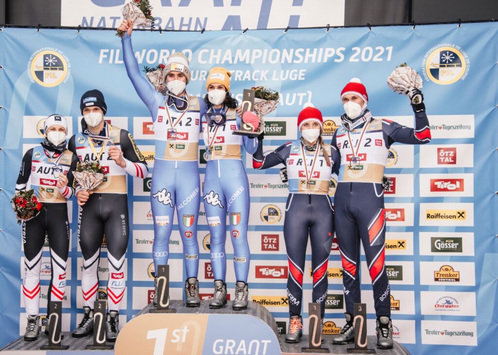 Abgeschlossen wurden die Titelkämpfe in Umhausen am frühen Sonntagnachmittag mit dem Teambewerb. Dort jubelten die Südtiroler Evelin Lanthaler und Alex Gruber, die sich in 2.29,71 Minuten durchsetzten. Für Lanthaler war es das zweite Gold bei dieser WM nach ihrem Triumph im Einsitzer der Damen. Silber gewann Österreich in der Besetzung Tina Unterberger/Thomas Kammerlander. Das Duo büßte exakt zwei Sekunden auf die neuen Weltmeister ein. Ekaterina Lavrenteva/Aleksandr Egorov (Russischer Rodelverband) belegten in 2.32,81 Minuten den Bronzerang.