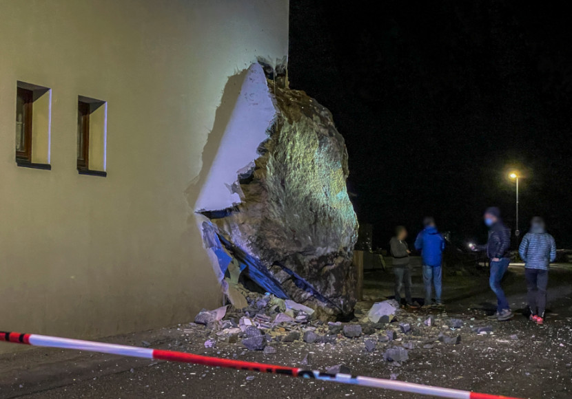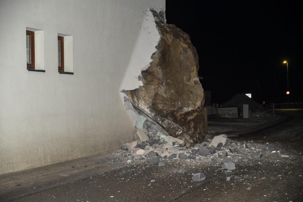 Gegen 2.15 Uhr donnerte am Freitag ein ca. vier Meter hoher Felsbrocken an ein Haus in Scheibe. Dieser blieb in der Hausfassade stecken. Verletzt wurde niemand.