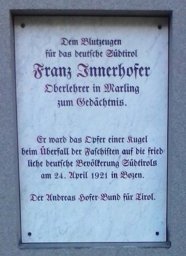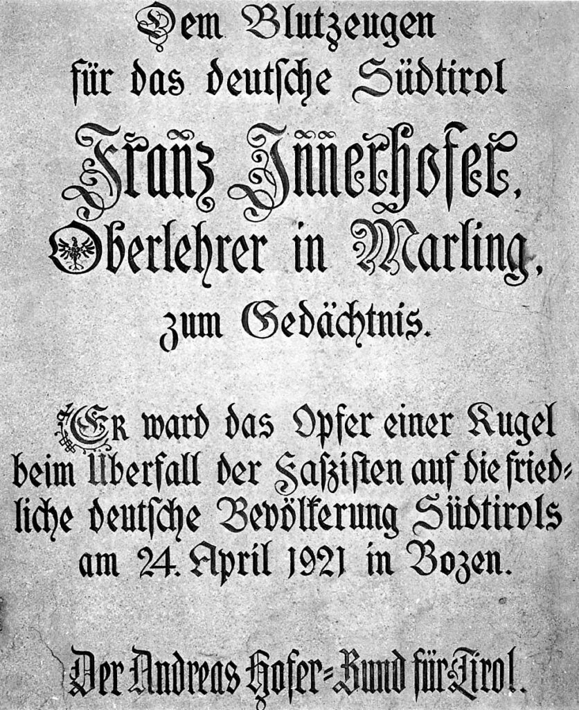 Der Südtiroler Parlamentsabgeordnete Dr. Eduard Reut-Nicolussi erklärte unter tosendem Beifall der Bevölkerung: „Dieser Tote liegt da drüben, aber wenn die Faschisten geglaubt haben, dass mit dem Franz Innerhofer unsere deutsche Treue erschlagen sei, dann haben sie sich getäuscht, bei Gott!“ (Zitiert aus „Landeszeitung“ vom 26. April 1921)