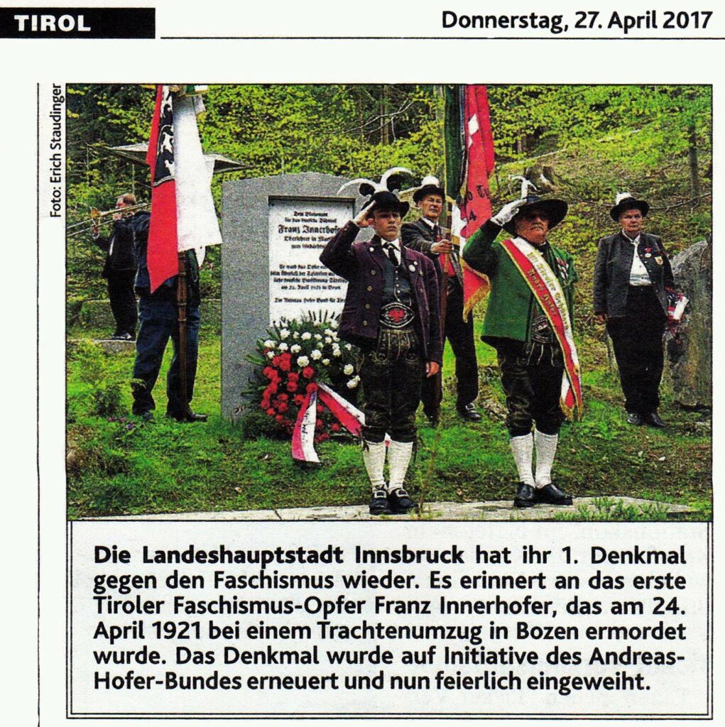 Eine ergänzte Neuauflage dieser Dokumentation wurde anlässlich des 90. Todestages von Franz Innerhofer 2011 durch den Effekt-Verlag in Neumarkt a. d. Etsch mit einem Beitrag des Landeskommandanten des Südtiroler Schützenbundes, Elmar Thaler, herausgebracht. Die Südtiroler Schützen hatten bereits 1996 anlässlich des 75. Todestages Innerhofers eine große Gedenkfeier in Bozen mit einem Marsch zum „Siegesdenkmal“ abgehalten. Dort hatten sie die Umbenennung des Siegesplatzes in „Franz Innerhofer Platz“ gefordert und eine selbstgefertigte Tafel angebracht, die dann von empörten italienischen Nationalisten wieder entfernt wurde.
