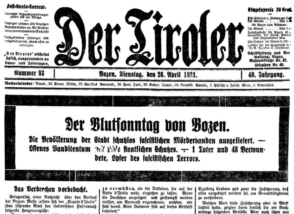 „Verehrte Freunde des Direktionskomitees der Fasci von Brescia und Verona – Der Fascio di combattimento von Bozen hat beschlossen, am Sonntag, den 24. des laufenden Monats, eine Kundgebung der Italianita zu veranstalten. Sie ist unbedingt nötig, da die Tiroler an diesem Tag in Massen in Tracht auftreten werden, um ihre Ansprüche auf die Stadt zu erheben, den äußersten Wachposten des Vaterlandes. Obwohl der Wahlkampf die Faschisten mehr oder weniger überall in Anspruch nimmt, glaubt dieses Zentralkomitee diesen kühnen Manipel der treuen Italiener doch nicht im Stich lassen zu können; deshalb ersucht es Euch innig dafür zu sorgen, dass eine möglichst umfangreiche Squadra am kommenden Sonntagmorgen nach Bozen kommt. … Wir rechnen mit Eurer Solidarität und Eurem Opferwillen.“ (Wiedergegeben in: Stefan Lechner: „Die Eroberung der Fremdstämmigen – Provinzfaschismus in Südtirol 1921-1926“, Veröffentlichungen des Südtiroler Landesarchivs Band 20, Innsbruck 2005, S. 125)