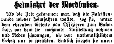 Über die Heimreise der faschistischen Horden berichtete Der Tiroler: „Als die Zeit gekommen war, dass die Faschistenbande wieder heimfahren wollte, zog sie unter dem ehrenden Geleite von Offizieren zum Bahnhofe, vor dem sie nochmals Aufstellung nahmen und Reden schwangen, die von nationalistischem Gehetz nur so sprühten. Endlich stiegen sie unter Geschrei in den Zug ein. Bei der Abfahrt ließen die Kerle noch einmal ihrem Deutschenhasse die Zügel schießen, indem sie mit ihren Revolvern herumfeuerten, als ob es mit den bereits verübten Bluttaten noch immer nicht genug wäre. Bei dieser Schießerei wurde dann auch noch ein Mann getroffen, und zwar ein in den Überetscher Zug eingestiegener Bauer, namens Franz Kofler aus Eppan. Die Kugel drang dem Manne durch den Hals. Es ist nur einem ganz besonderen Glück zuzuschreiben, dass das Projektil weder die Schlagader noch den Halswirbel traf.“