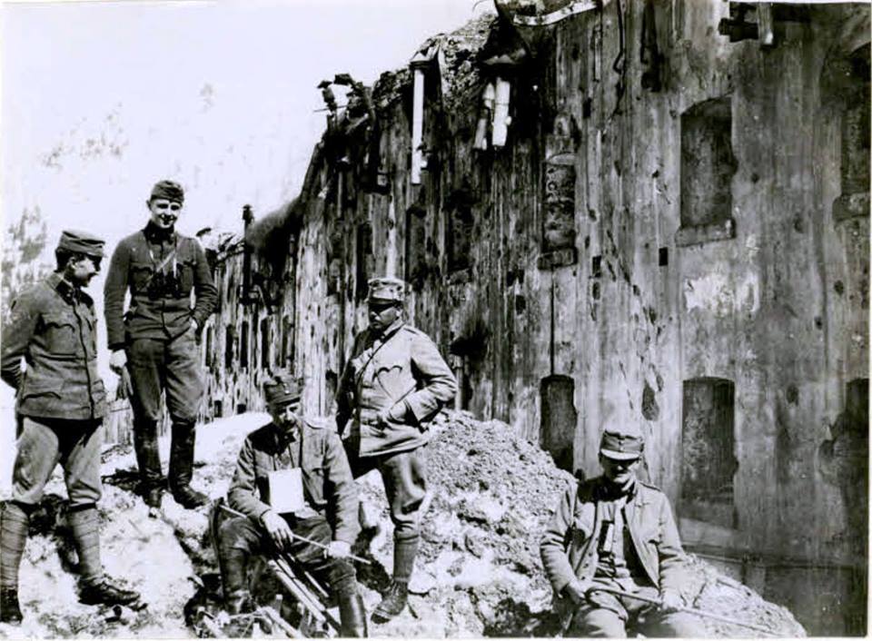Fritz Weber e Luis Trenker ritratti sotto le casematte del forte dopo un anno di intensi bombardamenti e di strenui attacchi italiani