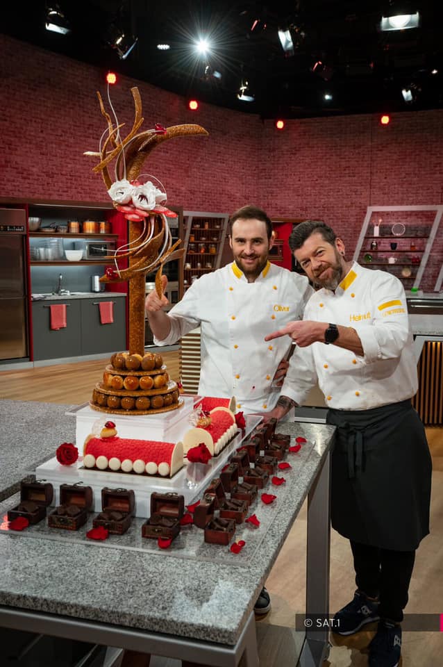 Ein französisches Hochzeitsbankett samt eines Nougatine-Schaustückes sollte die letzte Herausforderung der großen Sat.1-Backshow werden. Dabei sollte es um Perfektion gehen. Neun Stunden durften die Teams daran arbeiten. „Das atemberaubende Hochzeitsbankett im französischen Stil von Oliver und Helmut ist eine leckere Kombination aus Profiterols und einer fantastischen Torte. Diese wiederum besteht aus luftigem Schokoladenbiskuit, Mandelstreuseln, cremigen Moussevarianten und Karamell. Ergänzt wird das Kunstwerk durch selbstgemachte Macarons. Ein absoluter Blickfang und super-lecker!“, beschreibt Sat.1 das Produkt der Südtiroler auf der Homepage.